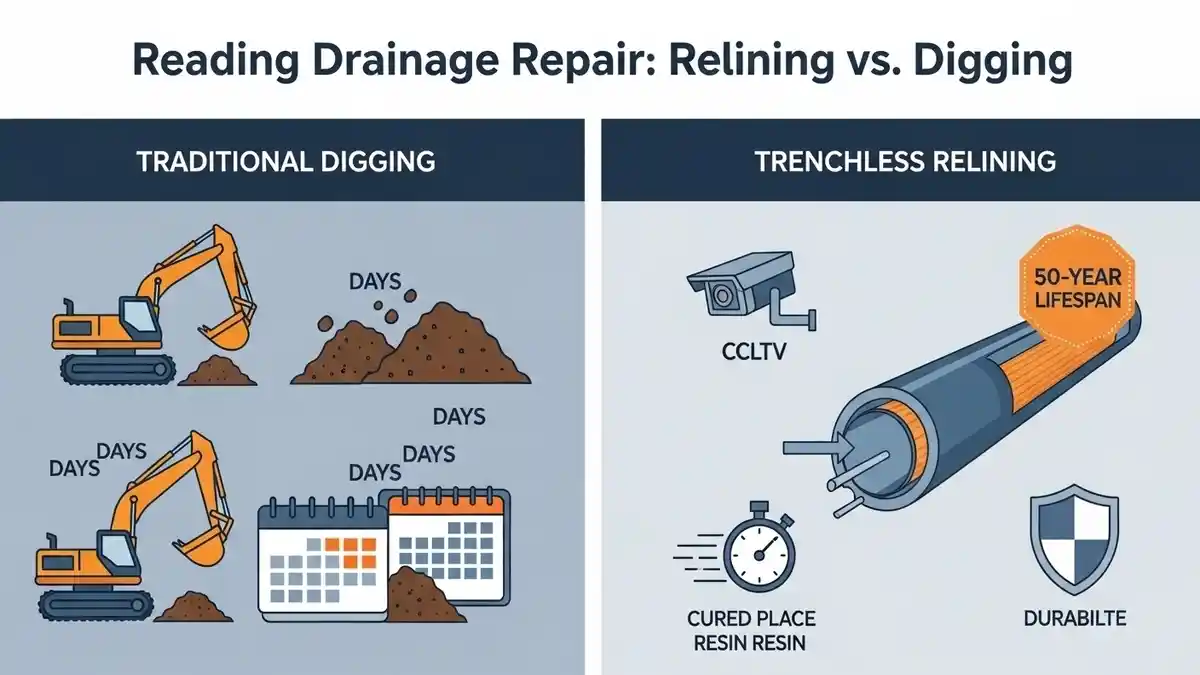 Avoid costly, messy excavations. Compare Borehamwood Drain Relining vs Digging to save your home, time, and money with our expert, minimally invasive, and durable no-dig repair solutions for local drains.